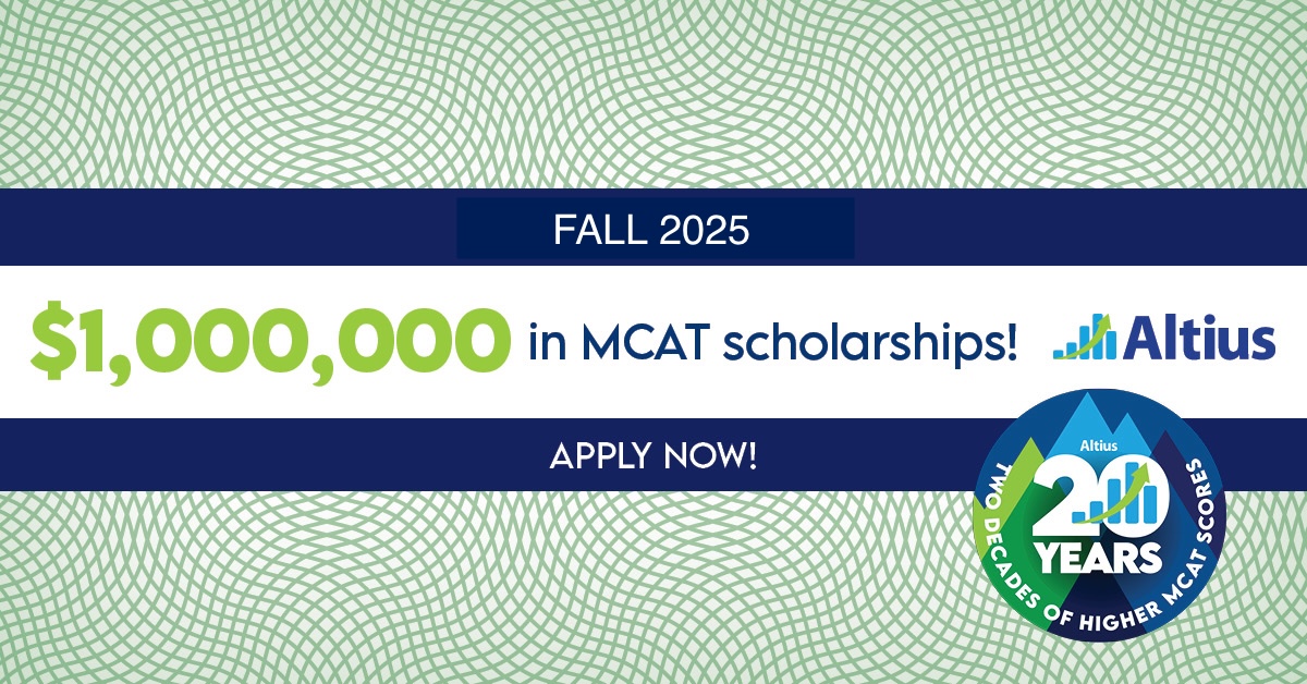 Finances should never stand between a dedicated student and a an MCAT score. Altius offers scholarships for deserving students who are able to demonstrate a dedication to studying for the MCAT.